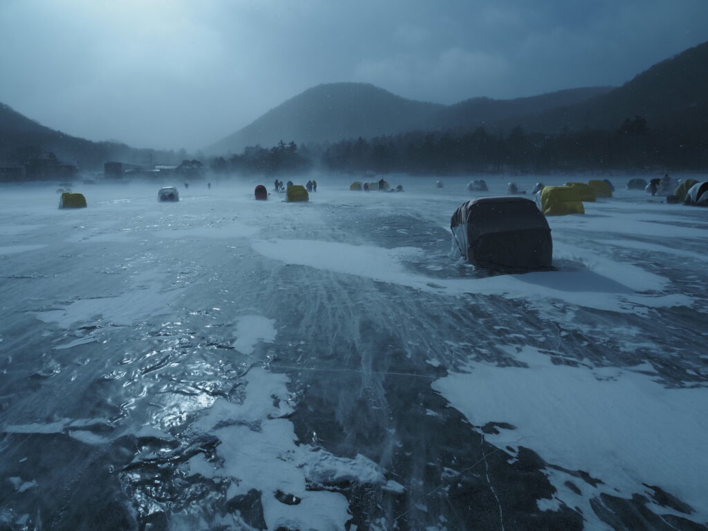 赤城山の大沼ではワカサギ釣りができます。この寒いなかたくさんの人が氷に穴をあけワカサギ釣りを楽しんでいました。