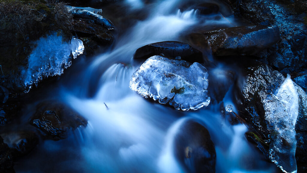 こちらは赤城山から離れ桐生市の渓流にて氷と川の流れを撮影した写真です。氷に光が入っていることからわかるように日中の明るい時間帯に撮影したもの。ライブNDを使用しています。フィルターなしで撮影できるのは本当に便利ですね。