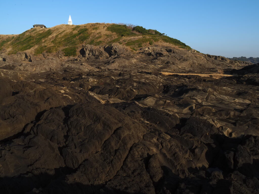 静岡県伊東市の城ケ崎海岸を訪れました。城ケ崎海岸は、4000年前に大室山が噴火した時に流れ出した溶岩によってできたそう。美しい柱状節理を撮影することができます。